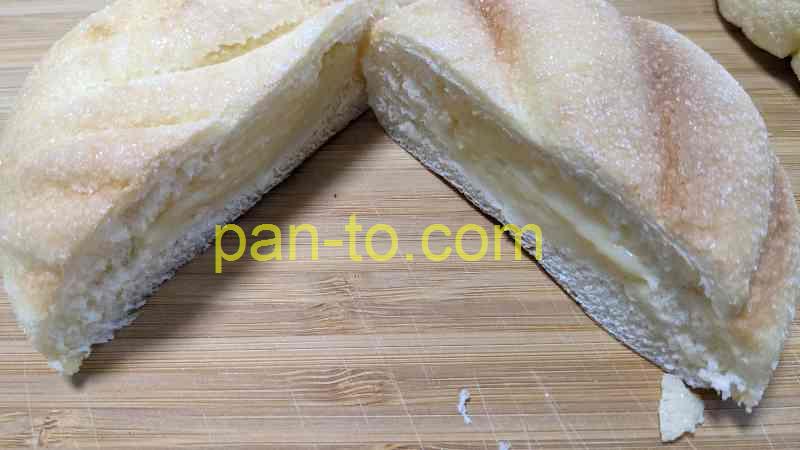 甘いクッキー生地が表面を覆っていて、生地の真ん中にはカスタードクリームの甘いパンです。しかし、カスタードクリームは上品な甘さで、全体的には程よい甘さの調和がとれているパンに仕上がっています。